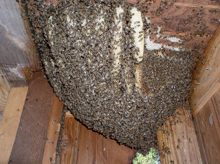 A friend and fellow beekeeper, Sherman Schlichting, and I tried to capture this hive of honeybees from the ceiling of an outside storage room. We cut down all the honeycombs and wired them into standardized bee frames. We were able to capture most of the bees but we must not have gotten the queen because the bees didn't stay in their new home. This is the fourth time that we have tried to capture a hive in this manner and so far we have lost all four hives back into the wilds. There will be a next time.